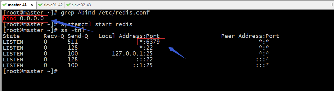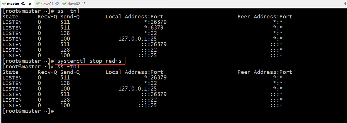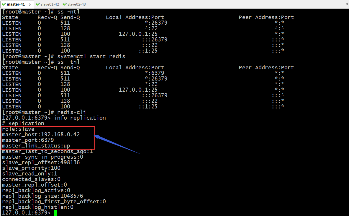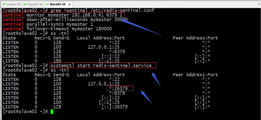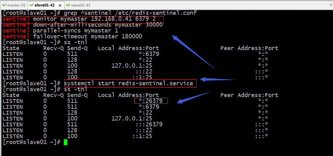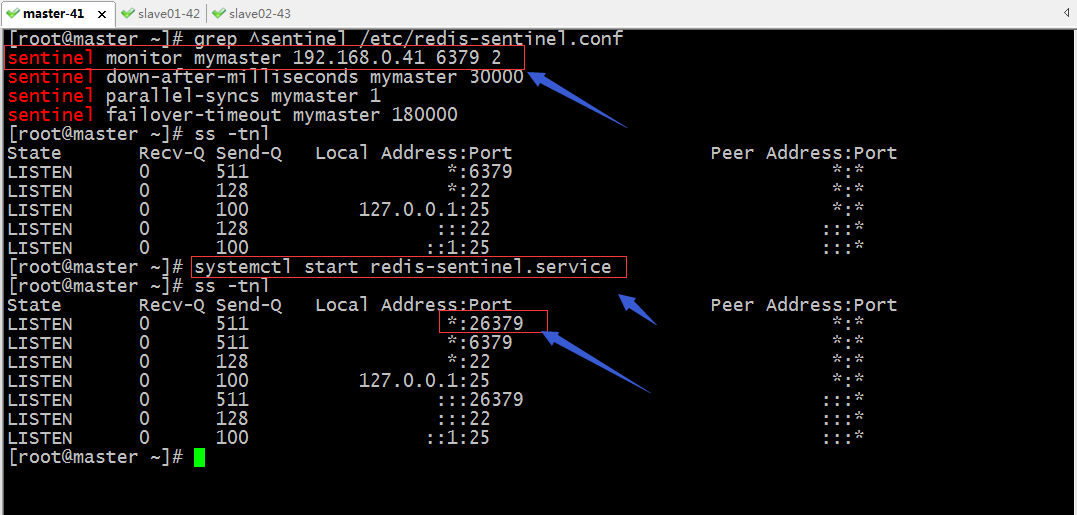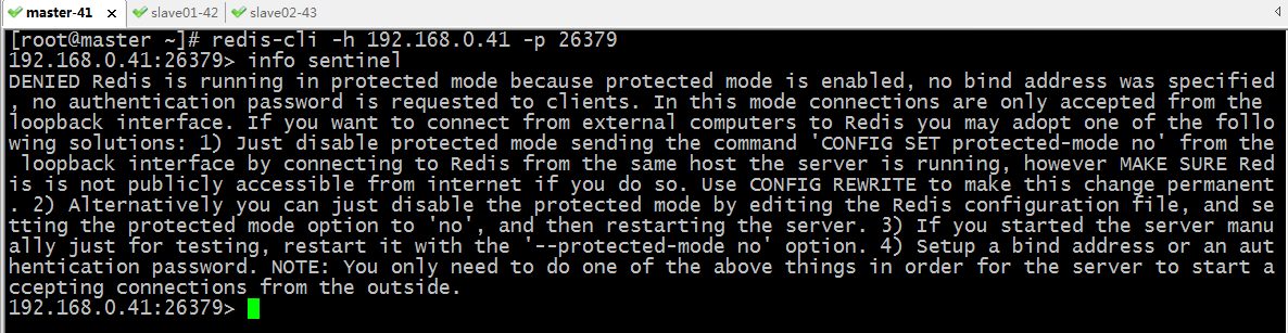 [root@master ~]# systemctl restart redis-sentinel.service[root@master ~]# ss -tnlState Recv-Q Send-Q Local Address:Port Peer Address:Port LISTEN 0 511 *:26379 *:* LISTEN 0 511 *:6379 *:* LISTEN 0 128 *:22 *:* LISTEN 0 100 127.0.0.1:25 *:* LISTEN 0 511 :::26379 :::* LISTEN 0 128 :::22 :::* LISTEN 0 100 ::1:25 :::* [root@master ~]# redis-cli -h 192.168.0.41 -p 26379 192.168.0.41:26379> info sentinel# Sentinelsentinel_masters:1sentinel_tilt:0sentinel_running_scripts:0sentinel_scripts_queue_length:0sentinel_simulate_failure_flags:0master0:name=mymaster,status=ok,address=192.168.0.41:6379,slaves=2,sentinels=3192.168.0.41:26379> info clients# Clientsconnected_clients:3client_longest_output_list:0client_biggest_input_buf:0blocked_clients:0192.168.0.41:26379> CLIENT LISTid=2 addr=192.168.0.42:59048 fd=14 name=sentinel-f60b324b-cmd age=38 idle=0 flags=N db=0 sub=0 psub=0 multi=-1 qbuf=0 qbuf-free=0 obl=0 oll=0 omem=0 events=r cmd=pingid=3 addr=192.168.0.43:37480 fd=15 name=sentinel-eada229c-cmd age=38 idle=1 flags=N db=0 sub=0 psub=0 multi=-1 qbuf=0 qbuf-free=0 obl=0 oll=0 omem=0 events=r cmd=publishid=4 addr=192.168.0.41:36706 fd=16 name= age=32 idle=0 flags=N db=0 sub=0 psub=0 multi=-1 qbuf=0 qbuf-free=32768 obl=0 oll=0 omem=0 events=r cmd=client192.168.0.41:26379>