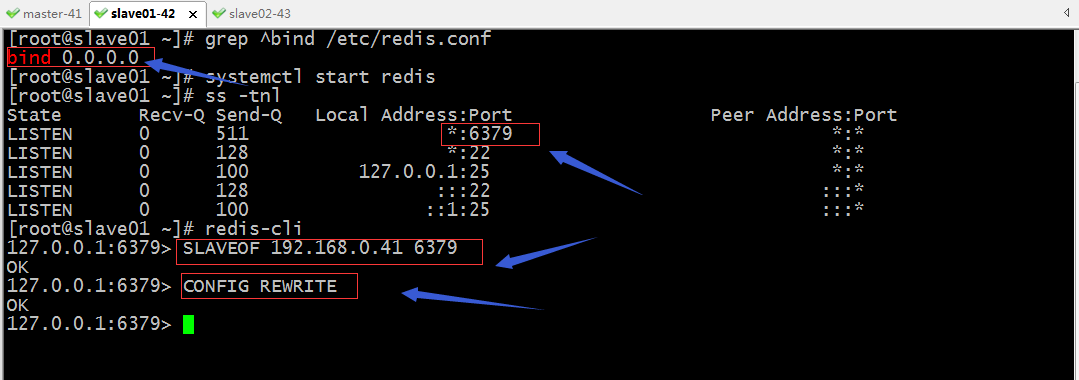 2、配置192.168.0.41/42/43上的redis監聽在非本機127.0.0.1上并配置42/43上的redis從屬于192.168.0.41