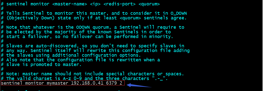 sentinel monitor <master-name> <ip> <redis-port> <quorum>:用于指定監控master節點的ip地址和端口以及有效法定票數;其中<master-name>是給監控的master一個名稱,可以隨便寫,起標識的作用;<quorum>表示sentinel集群的quorum機制,即至少有quorum個sentinel節點同時判定主節點故障時,才認為其真的故障;