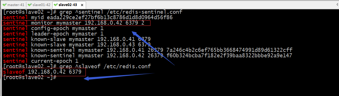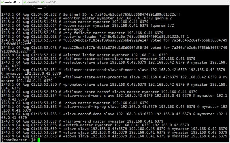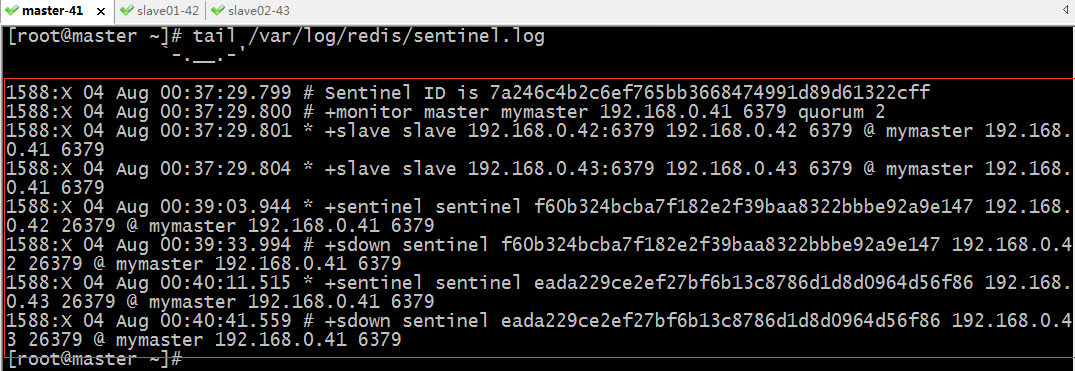 提示:從上面的日志信息可以了解到sentinel監控的master是192.168.0.41:6379;并且有兩個slave分別是192.168.0.42:6379和192.168.0.43:6379;