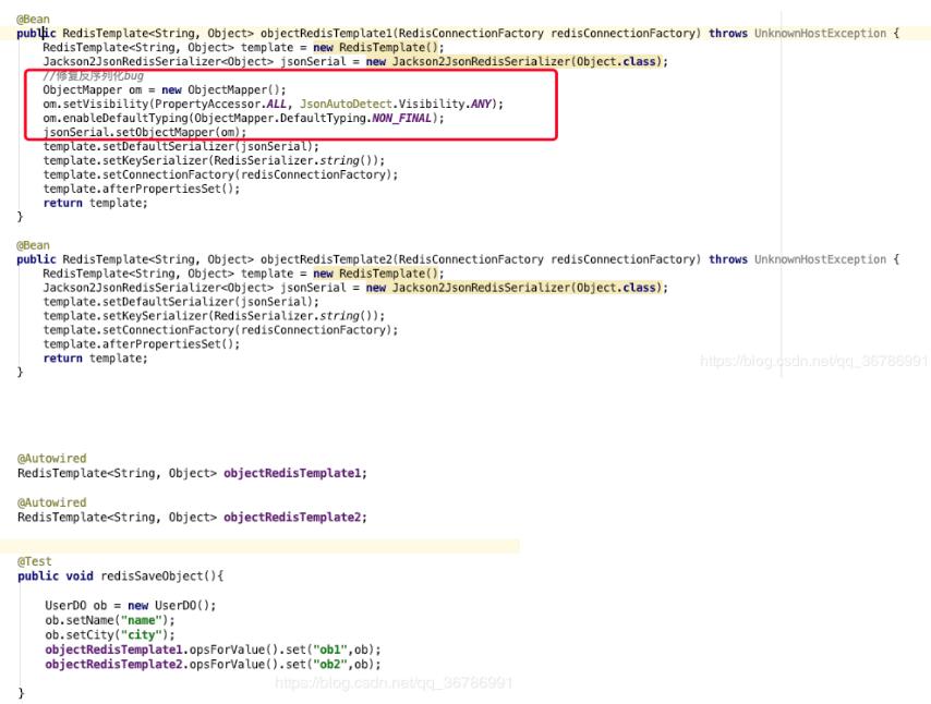 @Bean public RedisTemplate<String, Object> objectRedisTemplate(RedisConnectionFactory redisConnectionFactory) throws UnknownHostException { RedisTemplate<String, Object> template = new RedisTemplate(); Jackson2JsonRedisSerializer<Object> jsonSerial = new Jackson2JsonRedisSerializer(Object.class);// //修復(fù)反序列化bug// ObjectMapper om = new ObjectMapper();// om.setVisibility(PropertyAccessor.ALL, JsonAutoDetect.Visibility.ANY);// om.enableDefaultTyping(ObjectMapper.DefaultTyping.NON_FINAL);// jsonSerial.setObjectMapper(om); template.setDefaultSerializer(jsonSerial); template.setKeySerializer(RedisSerializer.string()); template.setConnectionFactory(redisConnectionFactory); template.afterPropertiesSet(); return template; }測試代碼為