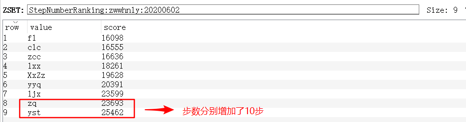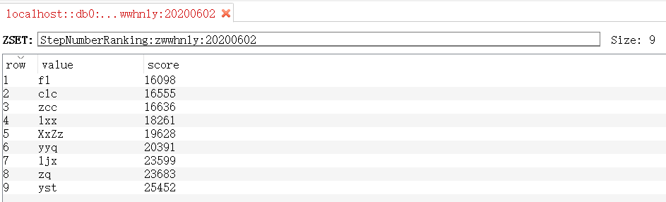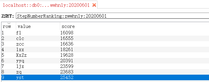 可以看到,默認(rèn)是以score正序排列的,也就是步數(shù)從少到多排列。
