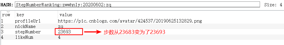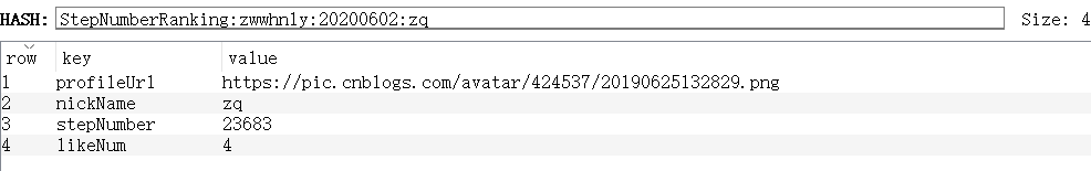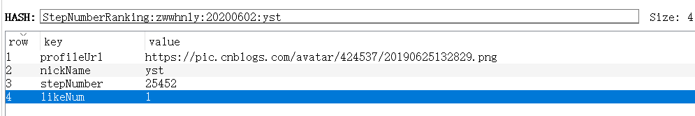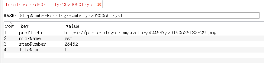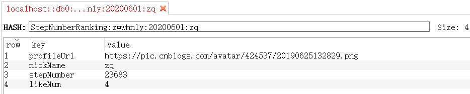 使用Redis的HASH數(shù)據(jù)結(jié)構(gòu),其中key為第2步的key+第3步的成員member,value分別存儲好友頭像、昵稱、步數(shù)、點贊數(shù),如下所示: