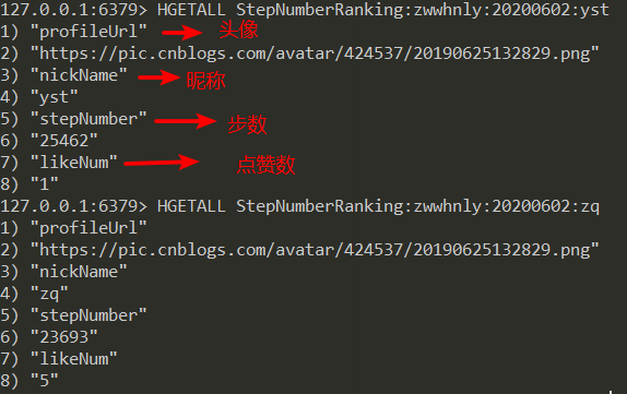 獲取到了排行榜里的好友信息,最后一步就是獲取這些好友的步數(shù)、點贊數(shù)、頭像、昵稱這些信息,也就是我們之前使用HASH數(shù)據(jù)結(jié)構(gòu)存儲的信息,此時我們可以使用HGETALL命令,如下所示: