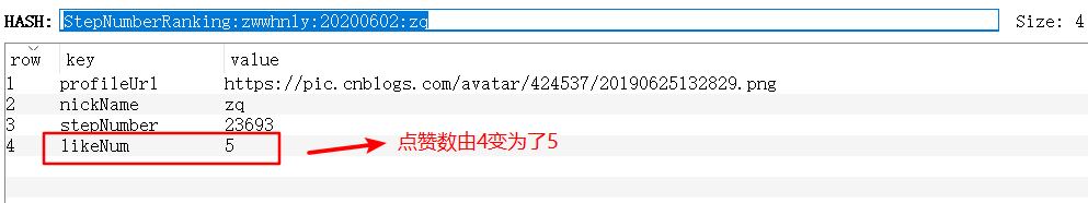 當(dāng)我們在步數(shù)排行榜里給好友點贊時,可以使用HINCRBY命令,把上圖中的likeNum加1: