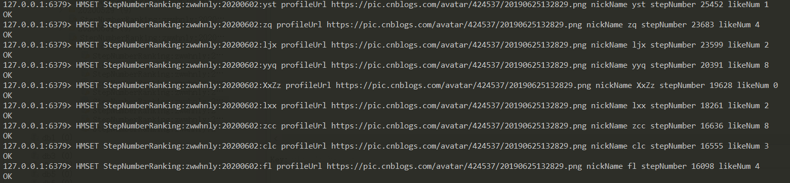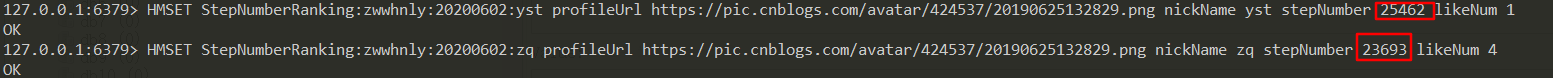 因為展示步數(shù)排行榜時,需要展示昵稱、頭像、步數(shù)、點贊數(shù),所以可以借助于Redis的HASH 數(shù)據(jù)結(jié)構(gòu)來存儲,這時就要用到HMSET命令: