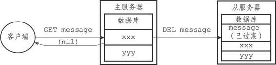假設在此之后,有客戶端向主服務器發送命令GET message,那么主服務器將發現鍵message已經過期:主服務器會刪除message鍵,向客戶端返回空回復,并向從服務器發送DEL message命令,如圖所示: