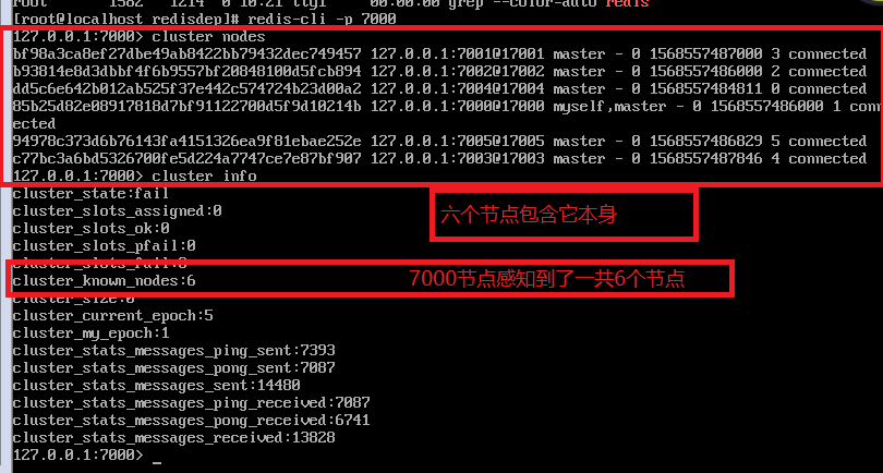 驗證:登錄端口號為7000節(jié)點以后,分別輸入cluster nodes和cluster info 命令。