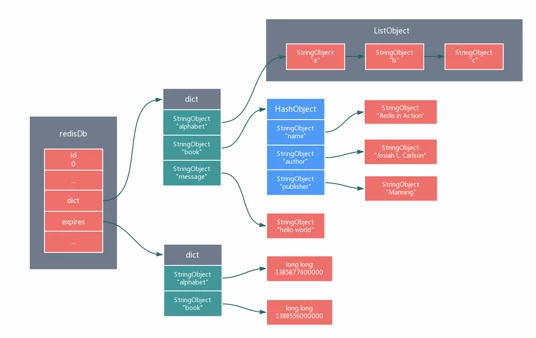 由于 Redis 是一個鍵值對數據庫(key-value pairs database), 所以它的數據庫本身也是一個字典,對應的結構正是 redisDb。其中,dict 指向的是一個記錄鍵值對數據的字典,它的鍵是一個字符串對象,它的值則可以是字符串、列表、哈希表、集合和有序集合在內的任意一種 Redis 類型對象。 expires 指向的是一個用于記錄鍵的過期時間的字典,它的鍵為 dict 中的數據庫鍵,它的值為這個數據庫鍵的過期時間戳,這個值以 long long 類型表示。