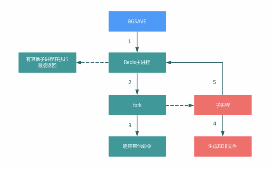 BGSAVE 是一個異步式的命令,和 SAVE 命令直接阻塞服務器進程的做法不同,BGSAVE 命令會派生出一個子進程,由子進程負責創建 RDB 文件,服務器進程(父進程)繼續處理客戶的命令。