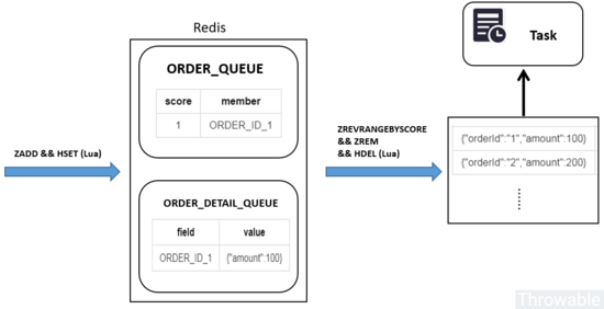 Sorted Set 的member和score添加到訂單隊(duì)列 Sorted Set 中。JSON 字符串分別作為field和value添加到訂單隊(duì)列內(nèi)容 Hash 中。Lua 腳本保證原子性。Sorted Set 的命令 ZREVRANGEBYSCORE 彈出指定數(shù)量的訂單ID對(duì)應(yīng)的訂單隊(duì)列內(nèi)容 Hash 中的訂單推送內(nèi)容數(shù)據(jù)進(jìn)行處理。對(duì)于第4點(diǎn)處理有兩種方案: