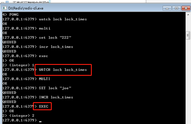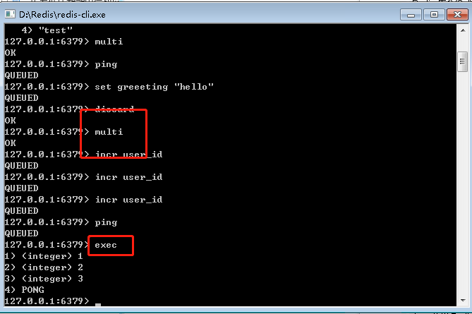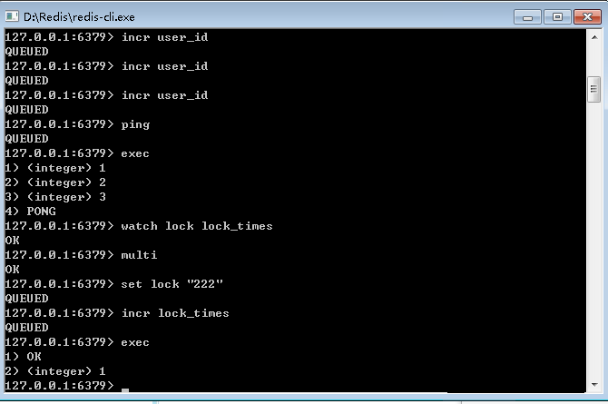 批量的命令在Exec命令之前,事務中任意命令執行失敗,其余的命令依然被執行。在事務執行過程,其他客戶端提交的命令請求不會插入到事務執行命令序列中。