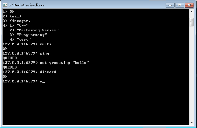 DISCARD取消事務,放棄執行事務塊內的所有命令。命令的執行如下所示。先選取一段命令,然后執行該命令取消