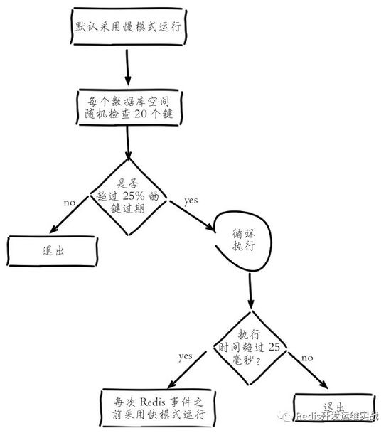 單單靠惰性刪除,肯定不能刪除所有的過期key,考慮到Redis的單線程特性,Redis使用了定期刪除策略,采用策略是從一定數量的數據庫的過期庫中取出一定數量的隨機鍵進行檢查,不為空則刪除。不保證實時刪除。有興趣的同學可以看看activeExpireCycle中具體實現,還是挺有意思的,下圖是個示意圖