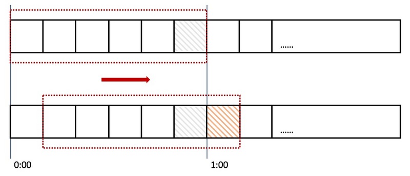 上面的計數器法簡單粗暴,但是存在臨界點的問題。為了解決這個問題,引入類似滑動窗口的概念,讓統計次數的周期是連續的,可以很好的解決臨界點的問題,滑動窗口原理如下圖所示: