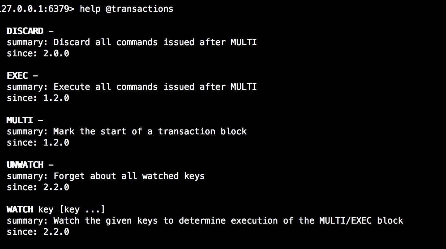 通大多數據庫一樣,redis所有的命令提供了幫助,可以使用help +命令名稱查看其使用方法,幫助信息中不僅有命令用法,還有命令始于版本信息,分組等。