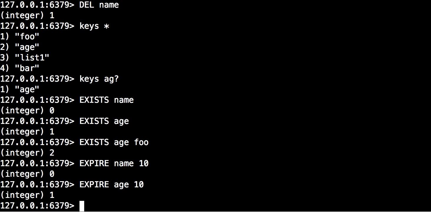 DEL key #刪除某個keyKEYS pattern #查看符合正則的所有keyEXISTS key [key ...] #判斷某個key是否存在,可支持多個,返回存在的個數EXPIRE key seconds #刷新某個key過期時間MOVE key db #移動key到某個數據庫