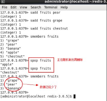 127.0.0.1:6379> sadd fruits pear(integer) 1127.0.0.1:6379> sadd fruits grape(integer) 1127.0.0.1:6379> sadd fruits chestnut(integer) 1127.0.0.1:6379> smembers fruits1) "grape"2) "pear"3) "banana"4) "apple"5) "chestnut"127.0.0.1:6379> spop fruits"apple"127.0.0.1:6379> spop fruits"chestnut"127.0.0.1:6379> smembers fruits1) "grape"2) "pear"3) "banana"127.0.0.1:6379>