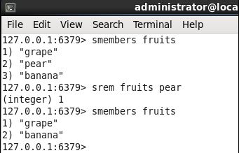 127.0.0.1:6379> smembers fruits1) "grape"2) "pear"3) "banana"127.0.0.1:6379> srem fruits pear(integer) 1127.0.0.1:6379> smembers fruits1) "grape"2) "banana"127.0.0.1:6379>