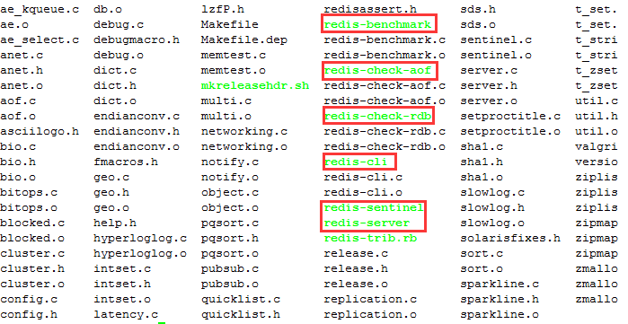 redis-server、redis-cli、redis-benchmark、redis-check-aof、redis-check-rdb、redis-sentinel。