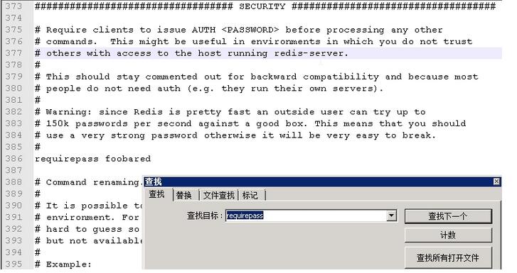 在解壓后的文件夾下面找到redis.windows.conf,使用文件編輯器進入編輯。找到requirepass,右邊的foobared即是對應需要設置的密碼。