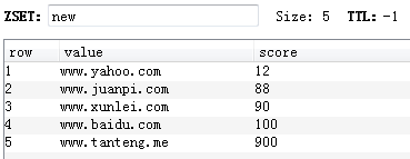 127.0.0.1:6379> zadd new 100 www.baidu.com 900 www.tanteng.me 12 www.yahoo.com 90 www.xunlei.com 88 www.juanpi.com(integer) 5