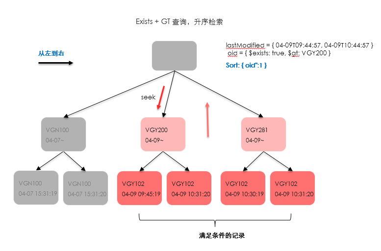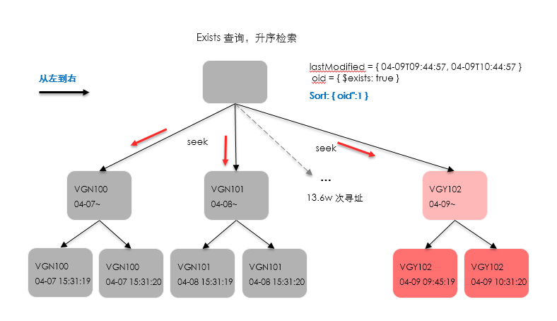 從現(xiàn)有的索引及條件來看,由于同時(shí)存在gt、exists以及葉子節(jié)點(diǎn)的時(shí)間范圍限定,不可避免的會(huì)產(chǎn)生seeks操作,