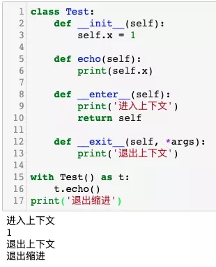 class Test: def __init__(self): self.x = 1 def echo(self): print(self.x) def __enter__(self): print('進入上下文') return self def __exit__(self, *args): print('退出上下文') with Test() as t: t.echo()print('退出縮進')運行效果如下圖所示: