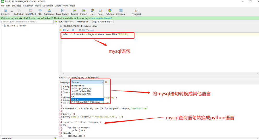 def person_handler(req_params, page_size, search_offset): """ 去mongo中查詢個人數據 :param req_params: :param page_size: :param search_offset: :return: """ results = [] query = {} update_time = {} if 'start_time' in req_params and req_params["start_time"]: start_time = int(req_params["start_time"]) update_time['$gte'] = start_time if 'end_time' in req_params and req_params['end_time']: end_time = int(req_params["end_time"]) update_time['$lte'] = end_time if update_time: query["update_time"] = update_time if 'file_type' in req_params and req_params['file_type']: query["file_type"] = req_params["file_type"] if 'user_ids' in req_params and req_params['user_ids']: query['user_ids'] = int(req_params['user_id']) serch_keywords = req_params["search_keywords"] query["$or"] = [ {"name": re.compile(serch_keywords)}, {"content": re.compile(serch_keywords)}, ] print(query) result = person_mongodao.search(filter=query).skip(search_offset).limit(page_size) count = person_mongodao.search(filter=query).skip(search_offset).limit(page_size).count() for row in result: results.append(row) additions = {"word_segs": req_params["search_keywords"], "remind": 0} print("查詢結果", results) return results, additions, count如果有小伙伴說我用的不是python語言譬如java用代碼怎么實現呢?那么如果你會寫mysql來實現上面的需求的話本博主可以推薦你使用mongo的一款可視化工具Studio 3T來將mysql語句轉換成mongo語句,python語句,java語句等