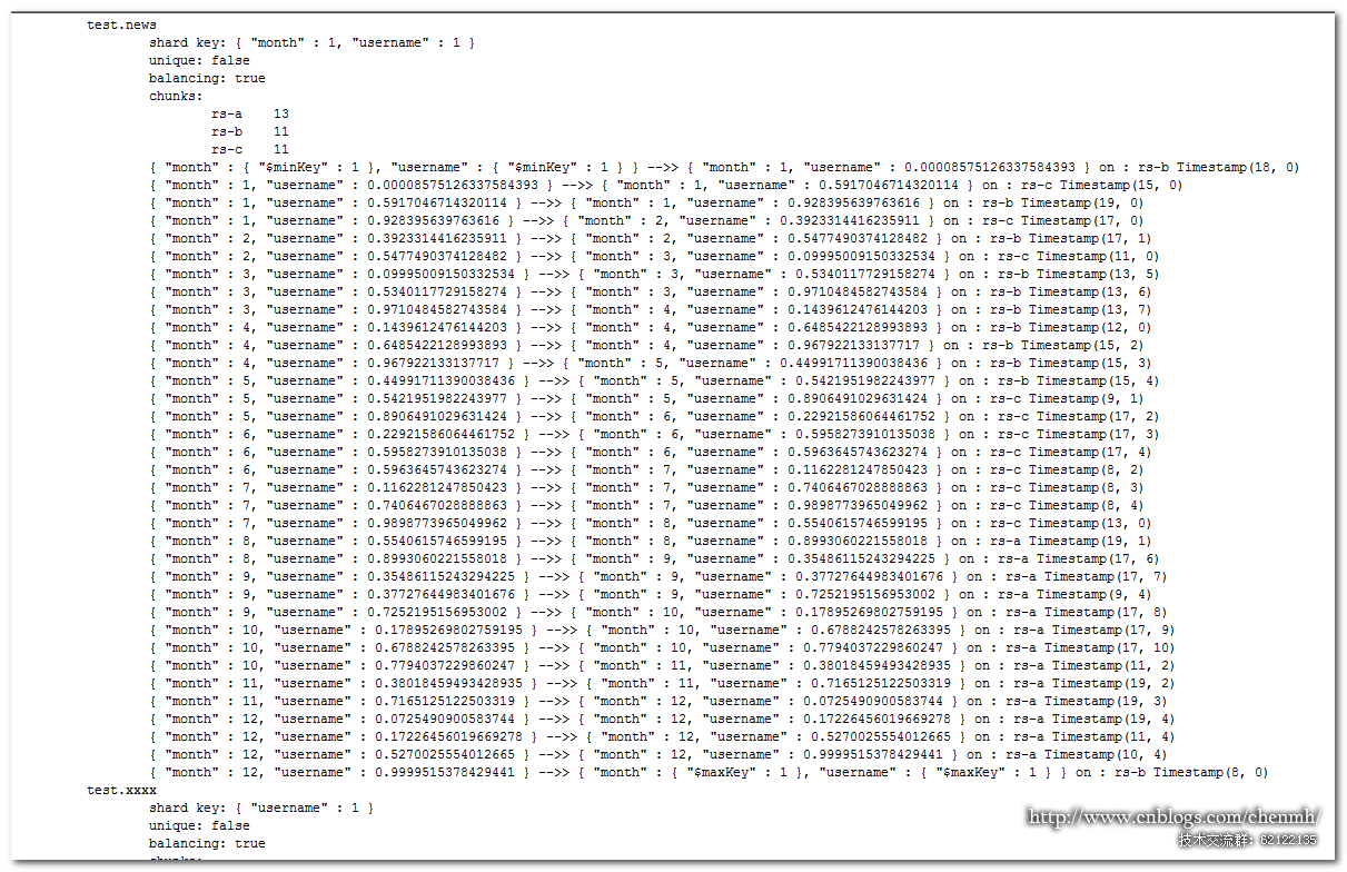 for(var i=100000;i<200000;i++){ db.news.insert({"_id":i,"month":"2","username":Math.random(),"createdate":new Date()})}新數(shù)據(jù)往一直往最末尾的分片(rs-a)上插,因為這個時候"month":2在最大的分片上。 { "month" : "1", "username" : 0.9258836896982892 } -->> { "month" : { "$maxKey" : 1 }, "username" : { "$maxKey" : 1 } } on : rs-a Timestamp(3, 1)