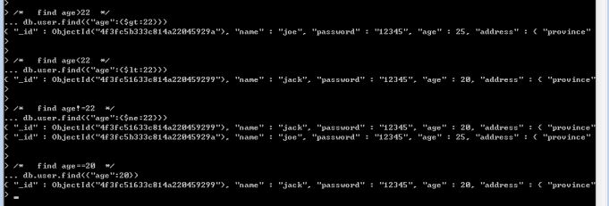 <4> 有時(shí)查詢很復(fù)雜,很蛋疼,不過(guò)沒(méi)關(guān)系,mongodb給我們祭出了大招,它就是$where,為什么這么說(shuō),是因?yàn)?where中的value