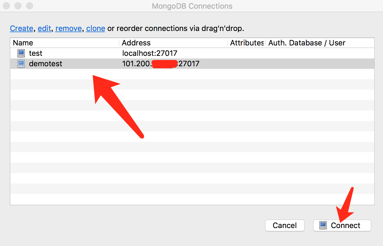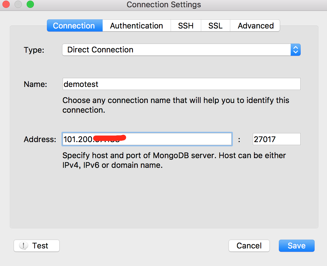 新建鏈接,address輸入服務(wù)器地址,端口填你mongo.conf里配置的?;径际?7027