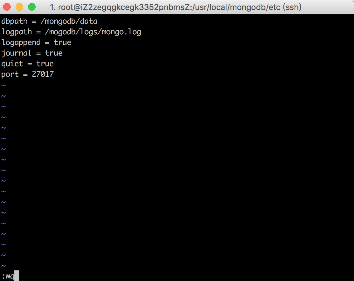 mkdir data //創(chuàng)建data文件夾,存放數(shù)據(jù)庫db文件mkdir logs //創(chuàng)建logs文件夾,存放日志文件cd logs //進(jìn)入logstouch mongo.log //創(chuàng)建log文件cd .. //返回上一級(jí)mkdir etc //創(chuàng)建配置文件夾cd etc // 進(jìn)入etcvim mongo.conf //編輯同時(shí)創(chuàng)建mongo.conf 文件