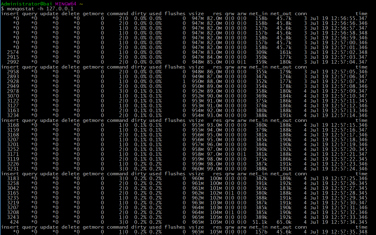 插入100000條數據,并打開mongostat查詢mongodb運行狀態