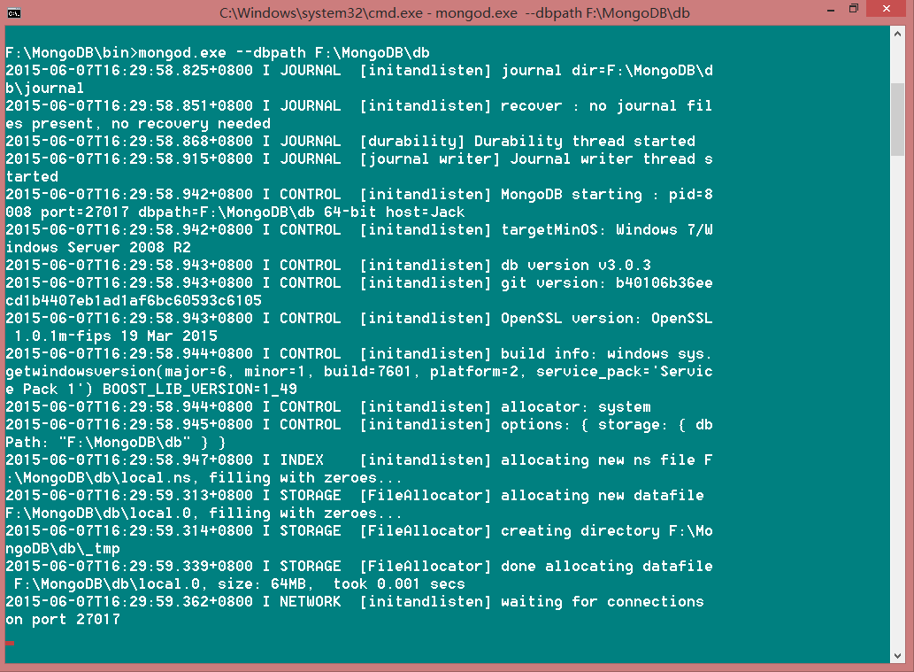 F:/MongoDB/bin>mongod.exe --dbpath F:/MongoDB/db