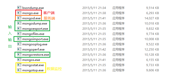 Ⅶ、打開MongoDB目錄下的bin文件夾,你會看到很多exe可執行文件,簡單介紹下: