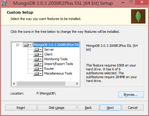 Ⅳ、默認全部功能安裝,選擇Browse更換安裝目錄到F:/MongoDB(自己選擇、)下,Next,然后選擇Install開始安裝: