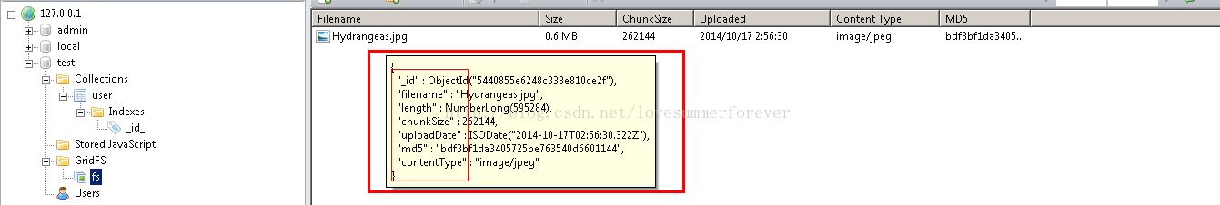 無論是bson對象還是GriFs中存儲的大文件,我們發現當添加一個文檔的時候,會自動的添加_id ,不同的是圖片添加后會自動的加上_id,chunkSize,md5,legnth,aliases等,這些屬性是我們上傳完圖片后,mongodb分析后自動添加的,系統自動保存。