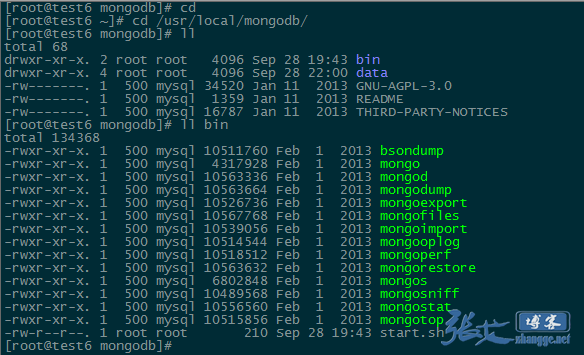 [root@test6 ~]# mv mongodb-linux-x86_64-2.6.4 /usr/local/mongodb[root@test6 ~]# cd /usr/local/mongodb/bin/[root@test6 ~]# ll