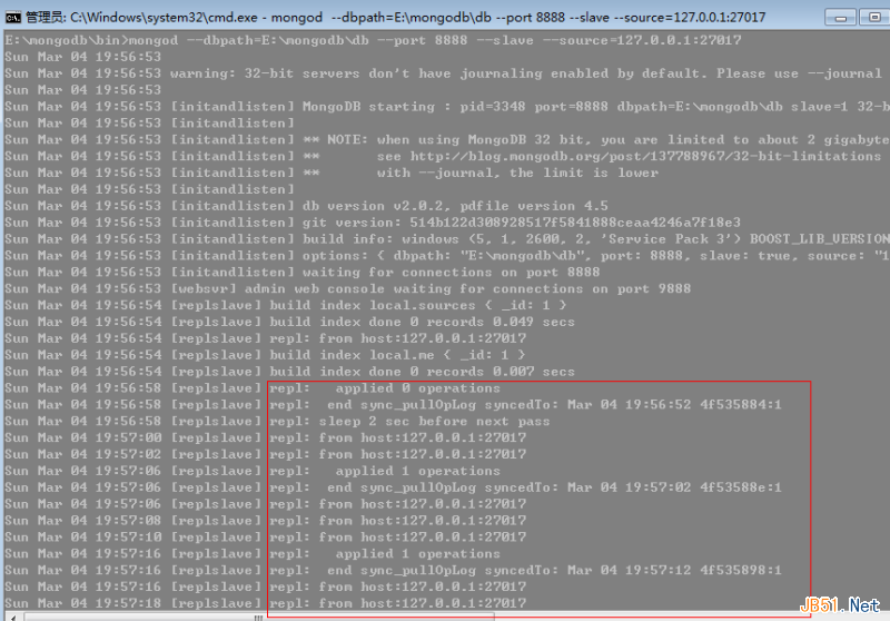 第三步:同樣的方式啟動E盤上的mongodb,指定該數據庫為從屬數據庫,命令也很簡單,當然我們要換一個端口,比如:8888。