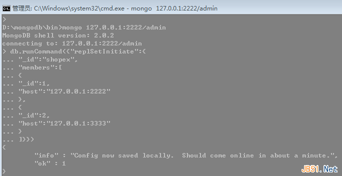 第一步: 既然我們要建立集群,就得取個集群名字,這里就取我們的公司名shopex, --replSet表示讓服務器知道shopex下還有其他數據庫,