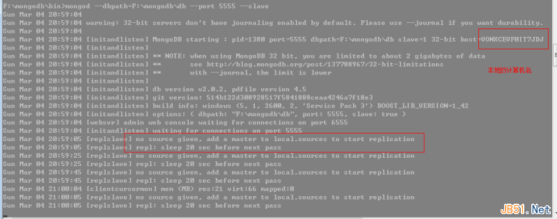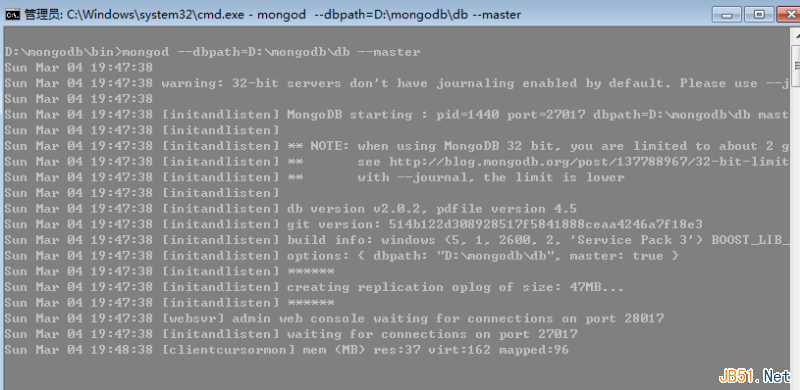 第二步:啟動D盤上的mongodb,把該數據庫指定為主數據庫,其實命令很簡單:>mongodb --dbpath='XXX' --master,