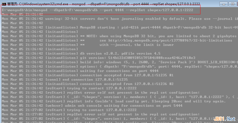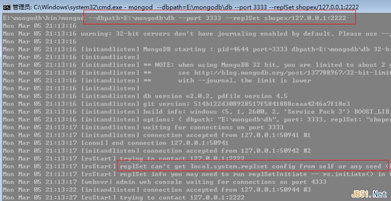 第三步: ok,看看上面的日志紅色區域,似乎我們還沒有做完,是的,log信息告訴我們要初始化一下“副本集“,既然日志這么說,那我也就