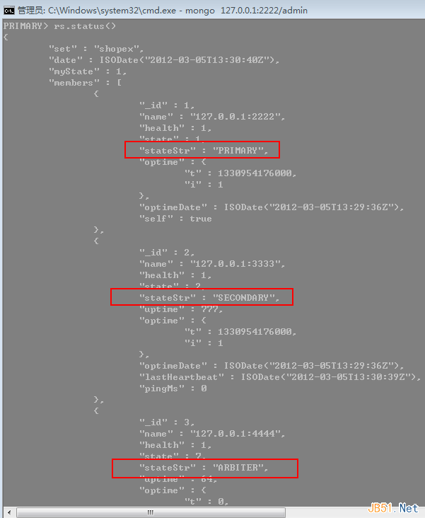 追加好了之后,我們使用rs.status()來查看下集群中的服務器狀態,圖中我們可以清楚的看到誰是主,還是從,還是仲裁。