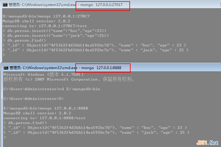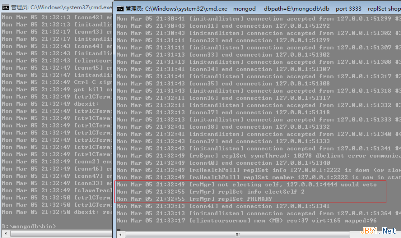 這里就把D盤里面的mongodb程序打開,端口為2222。指定端口為3333是shopex集群下的另一個數據庫服務器。