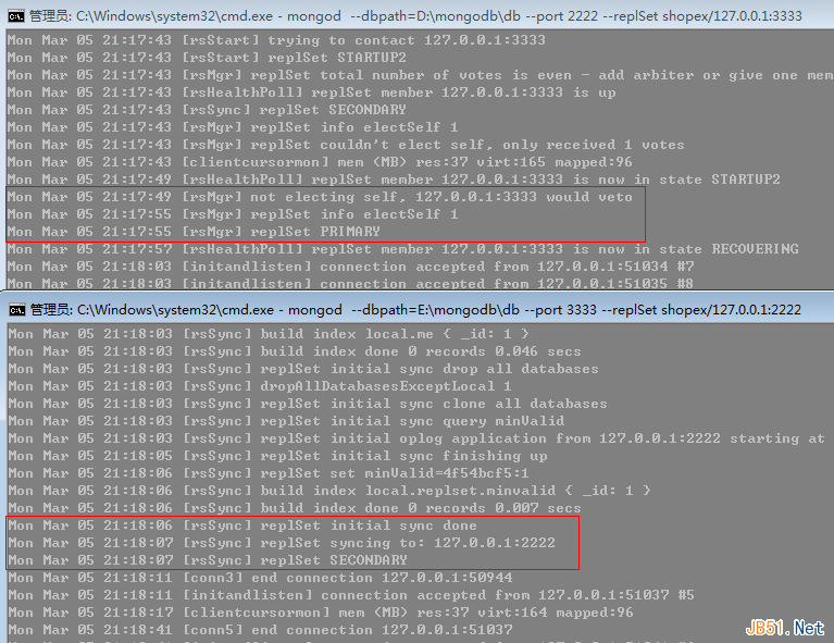 在3333端口的從屬服務器即可頂上,最后大家也可以再次使用rs.status()來看下集群中服務器的狀態。
