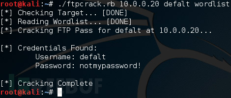 現在,我們根據該腳本的使用規則提供相應的參數值,并執行腳本。經過一段時間的等待,我們可以看到FTP服務器密碼被成功爆破: