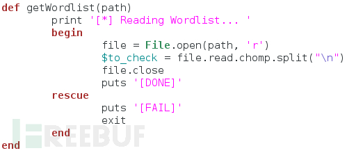 以上代碼我們簡單的使用了socket庫并丟了個IP地址,來建立與目標服務器的通信連接。同時,我們使用了timeout庫做了一個十秒鐘的超時循環,如果連接在十秒內未完成,腳本將會在客戶端界面提示用戶并關閉腳本。有了這些基本的功能后,下面我們使用以下函數來讀取用戶的字典列表文件: