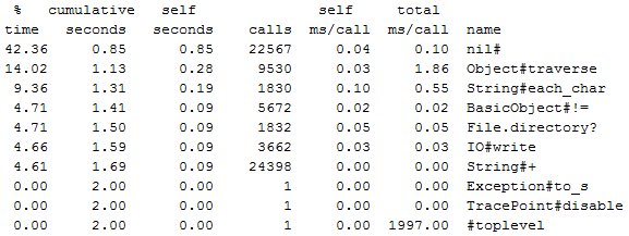 profile.rb是為Ruby程序準備的profiler,它可以統計并輸出各方法的運行時間,以便于找到程序執行的性能瓶頸。這次就用它來剖析腳本的運行時間。使用方法很簡單,加上命令行選項-r profile就可以: