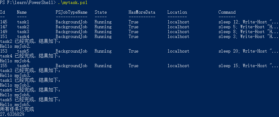 #定義 6 個(gè)任務(wù)$task1 = {sleep 12; Write-Host "Hello myJob1."; }$task2 = {sleep 5; Write-Host "Hello myJob2."; }$task3 = {sleep 8; Write-Host "Hello myJob3."; }$task4 = {sleep 3; Write-Host "Hello myJob4."; }$task5 = {sleep 20; Write-Host "Hello myJob5."; }$task6 = {sleep 15; Write-Host "Hello myJob6."; } #將 6 個(gè)任務(wù)寫入到一個(gè)數(shù)組中作為任務(wù)隊(duì)列$taskArr = $task1, $task2, $task3, $task4, $task5, $task6#運(yùn)行數(shù)組中的任務(wù),允許同時(shí)運(yùn)行 4 個(gè)任務(wù)Run-Tasks -taskArr $taskArr -parallelcount 4下面是運(yùn)行的結(jié)果: